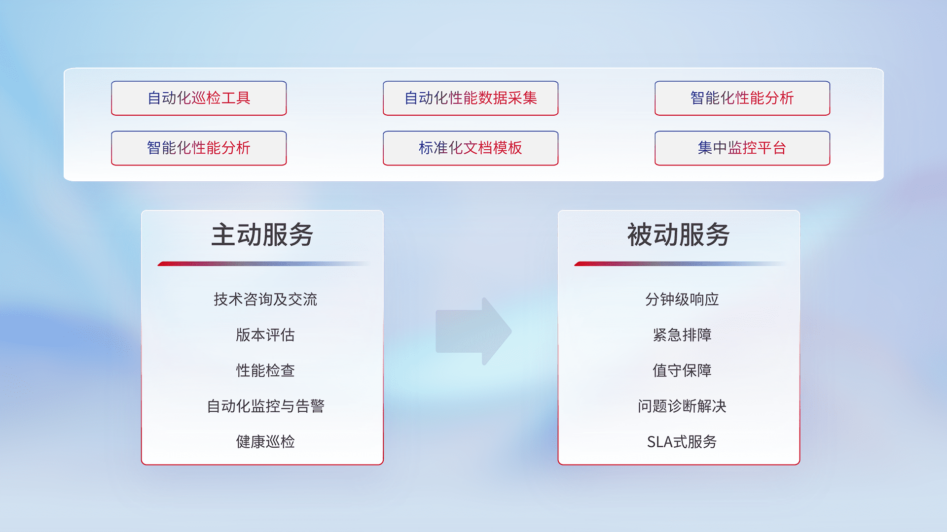 智能化工具和标准化文档,,,,保障服务质量,,,,提供主动服务(包含技术咨询、、、版本评估、、性能检查、、、、自动化监控与告警、、、健康巡检)和被动服务包含(分钟级响应、、、紧急排障、、、值守保障、、、问题诊断解决、、、SLA服务)。。