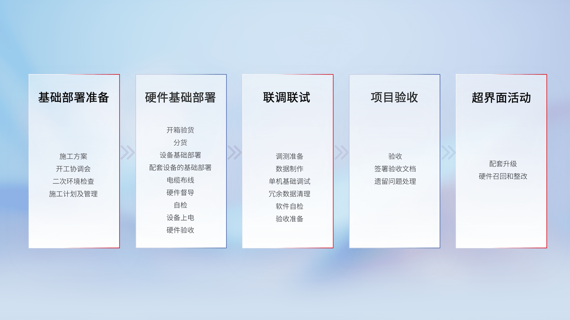 从基础部署准备、、、硬件基础部署、、联调联试、、、项目验收、、越界面活动的全过程可追溯,,保证施工质量和进度。。。。